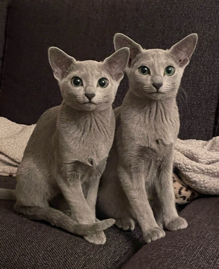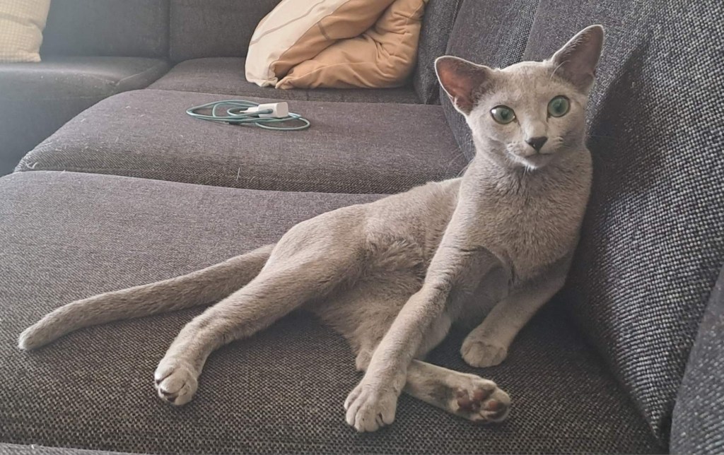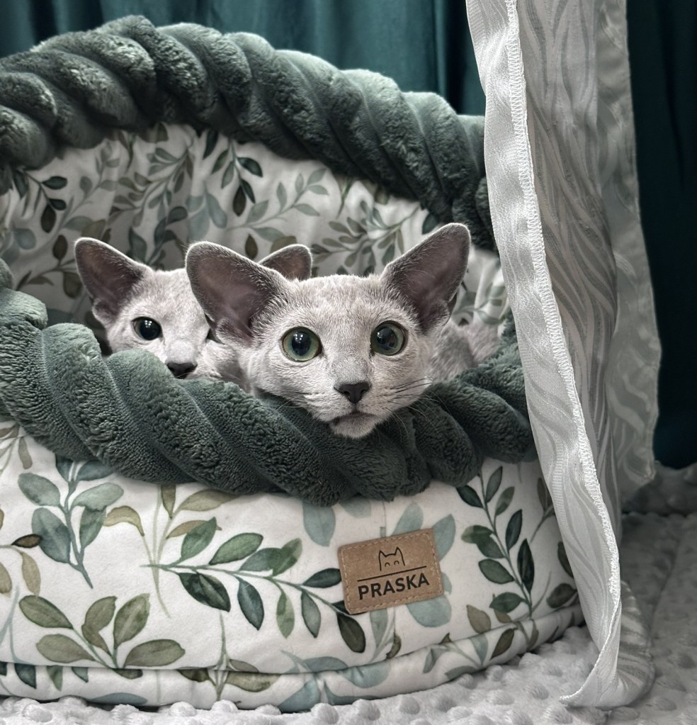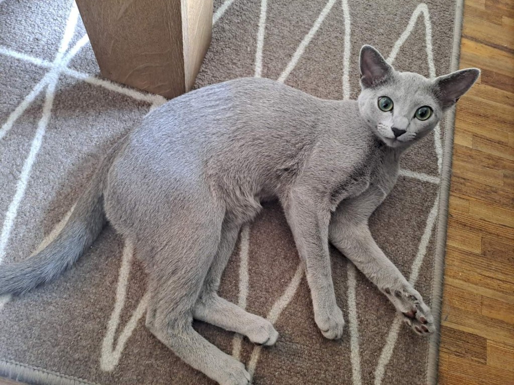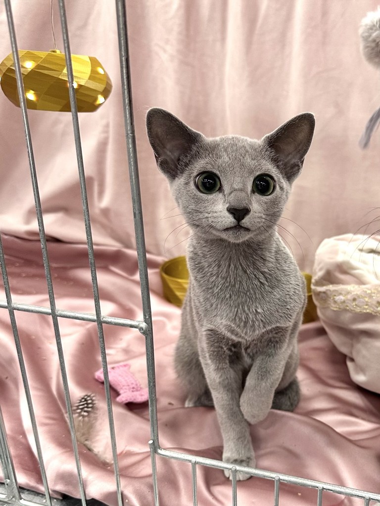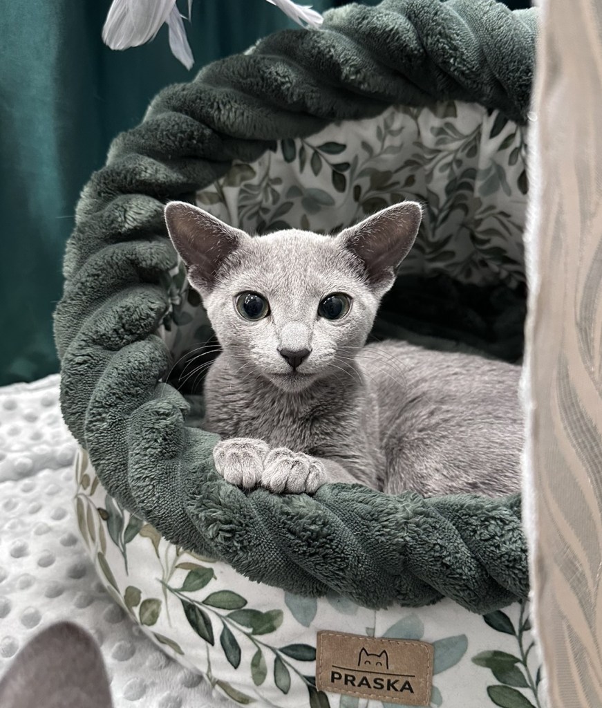 Meet Melody — our playful Russian Blue female with a mischievous streak and a soft, silvery coat. Below you can explore her gallery and see moments from her life, from playful antics to quiet cuddles.